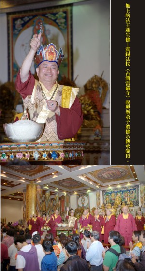 那麼今天在這裡呀!這一次回來,第一次在〈台灣雷藏寺〉跟大家初見面的談話。那麼……我自己也在想,這個……剛剛蓮哲上師也講了,他求師尊給大家一個灌頂,就是這個「傳承灌頂」,從大日如來、佛眼佛母、阿彌陀佛、蓮花童子一直到師尊,這個傳承的灌頂,就是說由大日如來變化佛眼佛母,佛眼佛母的雙眼變化成為摩訶雙蓮池,摩訶雙蓮池再由阿彌陀佛化身成為蓮花童子,蓮花童子再應身成為蓮生活佛盧勝彥。(眾鼓掌)