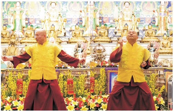 另外,我們的真銣師姐,她不喜歡亮相,她是一個偉大的母親。我們的啟仲師兄走遍天下,看得太多了!給我們唱一段大年初一的祈請文,怎麼樣?請上來。你看!這有功夫了,他什麼都不怕!說唱就唱,說做就做!(啟仲師兄唱大年初一的祈請文)好!這個走江湖不是只有一招、三招,至少要有好幾招才能夠走江湖的!我們的蓮店上師有「二十七式金剛亥母瑜伽拳」,怎麼樣?走一下江湖吧!在這大年初一,妳表演給大家看。你看!這個懂得三招、兩招的,就可以走江湖;請大家看看她的「二十七式金剛亥母瑜伽拳」,因為穿喇嘛裙的關係,有一些招式不太方便做。(蓮店上師表演金剛亥母拳)