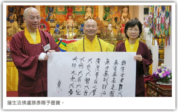 在法王為〈大願學會〉進行安座開光儀式後,還慈悲地為〈蓮花童子殿〉、〈高王觀音殿〉以及〈大願土地公〉題字,並賜下一幅墨寶:「與道合者謂大,無邊無盡是願,無分無別即協,廣度群生之會,大悲大智大吉,大利大有大空,大明大光大壽。」期許〈大願學會〉將來能得無上成就,廣度眾生!