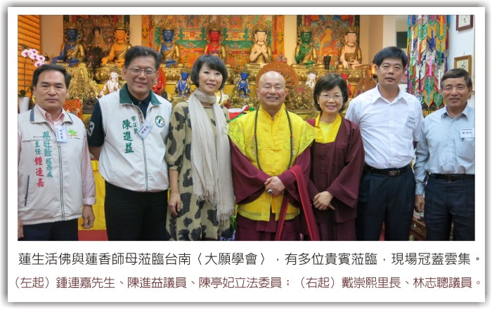 當天下午冠蓋雲集,蒞臨的貴賓,除了《真佛宗》上師、法師、各級弘法人員,還包括了前台南市長—現任立法委員許添財先生、立法委員陳亭妃小姐、〈台灣省政府〉祕書長鄭培富先生、台南市郭信良副議長、〈民進黨台南市黨部〉主委台南市蔡旺詮議員、陳怡珍議員、陳進益議員、林志聰議員、趙昆原議員、台南東區區長吳明熙、〈台南市府東派出所〉姚宏昇所長、裕聖里長戴崇熙、自強里長鍾連嘉、〈國立成功大學〉王醴教授、〈崑山科技大學〉施佳玫副教授、屏東〈大仁科技大學〉葉淑雯助理教授、嘉義市〈聖馬爾定醫院〉外科主任吳東龍醫師、專科護理師林郁玲小姐、〈台灣雷藏寺〉公關主任王資主先生、〈華光功德會〉南區分會邱正義會長等社會賢達。