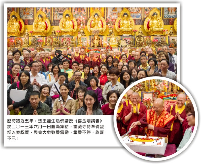 歷時將近五年,法王蓮生活佛講授《喜金剛講義》於二○一三年六月一日圓滿集結,雷藏寺特準備蛋糕以表祝賀,與會大眾歡聲雷動、掌聲不停,欣喜不已!
