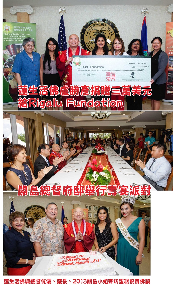 是日午宴,法王蓮生活佛亦捐贈三萬美元予總督夫人所設立的〈Rigalu Foundation〉做為慈善基金。回顧法王蓮生活佛的一生,祂七十年來如一日,每日不斷的修法、寫作、度眾,不論在修行上的成就,或是所利益的眾生,皆是無遠弗屆!二○一四年五月六日獲得此三項極大的國際殊榮,真是實至名歸,眾望所依!