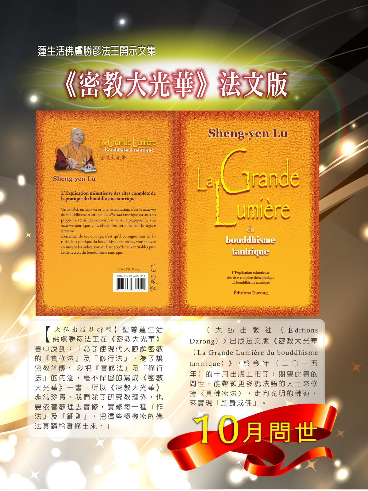 〈大弘出版社( ditions Darong)〉出版法文版《密教大光華(La Grande Lumière du bouddhisme tantrique)》,於今年(二○一五年)的十月出版上市了!期望此書的問世,能帶領更多說法語的人士來修持〈真佛密法〉,走向光明的佛道,來實現「即身成佛」。