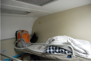 ▼火車上對稱的上中下六個「硬臥舖」床位,每個床位的狹小空間僅容個人翻身。