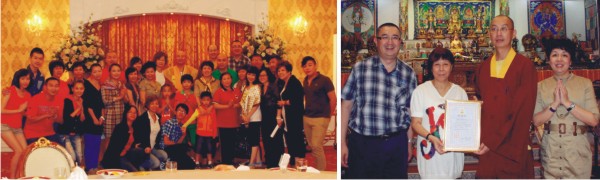 左圖:聖尊蓮生活佛與捐贈善款贊助《燃燈雜誌》的同門們合影紀念。