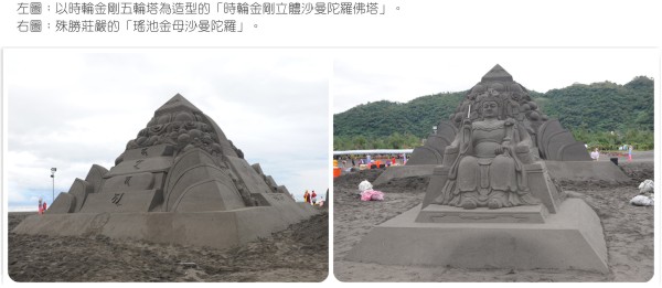 以沙造塔確實是神奇,但大家不知道這樣一座「時輪金剛立體沙曼陀羅佛塔」,卻須花費二週的時間來建立。此次的沙雕藝術總監王拙老師表示,由於天候不佳,頭城幾乎每日都是陰天豪雨,施工不易,但卻也讓需要水分的沙雕作品更為紮實;而為了讓沙曼陀羅佛塔能長期保存,更運用了特殊的上膠技術,因為「東北角國家風景區管理處」已特別核准,讓這兩座沙曼陀羅於原地保留一年,供所有來到此處的遊客參觀欣賞。在一般人眼中,或許只是一項藝術品,但在密教的甚深意涵中,「沙曼陀羅佛塔」就是佛的淨土與宮殿,每一位有緣親見「時輪金剛立體沙曼陀羅佛塔」的眾生,都將得到「見即解脫」的無上法益,更遑論繞塔禮拜所能獲得的殊勝功德。