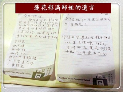 今晚是蓮花彩滿師姐頭七的日子,經過她孩子的同意下,僅以這篇短文呈現她的遺言,讓見聞者皆得到法益。祈願蓮花彩滿師姐往生摩訶雙蓮池,功德圓滿!