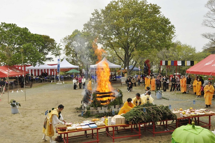 在法會的前一週,世界各地同門陸續趕到,幫助布置法會、清掃會場。有的掃落葉、有的拔雜草、有的擦佛龕壇城、有的劈柴砍木、有的擺放座椅、有的掛燈籠……,靜香上師更是跑上跑下忙著各式工程、指揮布壇。四月的日本天氣是多變的,靜香上師準備了六頂大帳篷,為來賓、信眾遮風擋雨。同門個個忙得不亦樂乎,皆因為虔心為道場服務,心生歡喜。