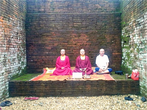 ▼一行人在千年佛塔的禪修方洞內共修一壇法。