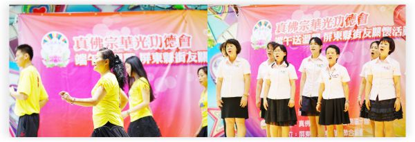 近中午時分,主辦單位準備了豐盛的佳餚款待街友。〈華光功德會〉特別邀請了〈歸來社區親子鼓舞團〉、〈青山育幼院舞樂團〉、〈天音雅樂合唱團〉及〈陽光舞供團〉等團體,其精彩的演出無不獲得如雷的掌聲。