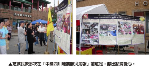 在此次SUMMER FAIR上,〈芝城雷藏寺〉的攤位中央安放著家喻戶曉的觀世音菩薩的金身,鮮花簇擁,檀香陣陣,格外莊嚴。大篇幅的海報詳細介紹了大陸四川省汶川地區大地震的災情,從早晨八點到下午五點,頂著炎炎烈日,〈芝城雷藏寺〉的義工們,熱情地引領著遊人禮佛敬香,並非常耐心而詳細地介紹了大地震災情和〈華光功德會〉的救災工作。