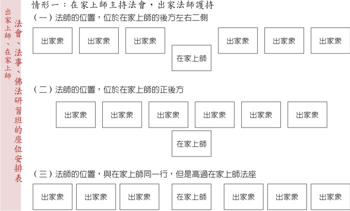 任何法會、法事、佛法研習班,若主持者是在家眾(如居士上師、居士教授師),列席或參加者有《真佛宗》出家眾,則在席位安排上,《真佛宗》出家眾必須坐在主持者之後,法座高度與主持者相同。