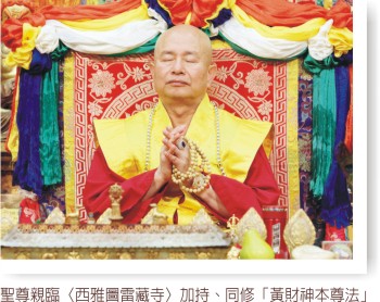 晚上八時,雷藏寺善信齊聚,還有巴拿馬、德州、溫哥華等外地的同門來參加同修。這天同修「黃財神本尊法」,在司儀法師的帶領下,眾同門善信專注持咒、觀想,接受蓮生法王的傳承法流加持,祈願黃財神賜福、消災、增吉祥。