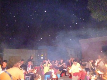 第二晚,大家一到就馬上把供品擺好位置,做好準備;上師把燈關上,讓大家更靜心的去觀火;火柔和了,煙也減少了,大家都在享受火的沐浴。第三晚,大家有點輕鬆了。供品多了些,水果又多了些;金剛鈴聲此起彼落,供品匆匆下爐後,便忙著學打手印─「香、花、燈、茶、果」、「息、增、懷、誅」,忙得不得了;在團團火光照映下,汗如雨下,水、火交加,瀰漫了整個場地,猶如被帶到另一境界去了。