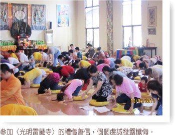拜懺由本寺蓮花國龍助教帶領唱誦,法器由青少年組協助。入懺時,大家共同在莊嚴的壇城前,虔誠一心禮拜懺悔,祈求根本傳承上師蓮生活佛及諸佛菩薩大力加持,令一切災難消除,清淨自身的三業、福慧增長,所求如願。禮懺依序如儀進行,宏亮圓潤專一的唱誦聲,字句清晰,牽動了在場禮懺同門的每一顆心,致心發露懺悔,把往昔所作諸惡業,發願不再復造。