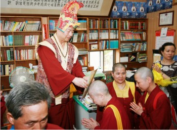在加持壇城後,李堂主恭請聖尊說法開示。聖尊開示時說,〈三義真佛學會〉的風水很好,並對寺廟要興旺提出幾項建議,予以勉勵:一是周邊道路要便利,二是寺廟必須莊嚴,三是住持要有相應證量。