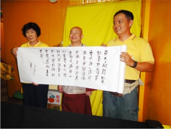 【蓮育法師.花蓮訊】二○一○年七月廿二日上午十點多,聖尊蓮生活佛一行到達花蓮〈東海同修會〉,揮毫賜法偈後,聖尊為堂主等做畫符灌頂,並為壇城開光加持,堂主及代表等敬獻哈達、龍袍,並致詞恭請師尊法語開示。