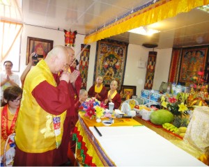 【燃燈.高雄訊】二○一○年七月九日,蓮籍上師率高雄地區分堂堂主、善信,齊聚高鐵左營站,恭迎聖尊蓮生活佛蒞臨說法。聖尊於下午三時許抵〈大雄堂〉後,先上香、敬禮壇城、加持咒水,接著揮毫賜法偈。鄧堂主等敬獻哈達,並致詞請法。